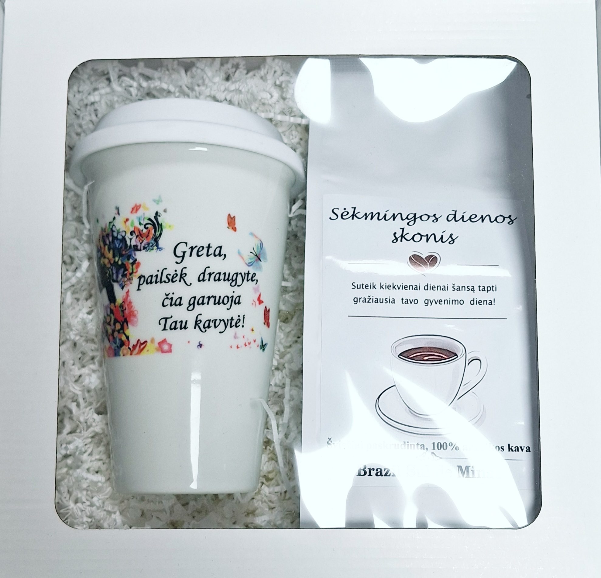 Rinkinį sudaro daugkartinis ECO keramikos puodelis ir kavos pakuotė dovanų dėžutėje.