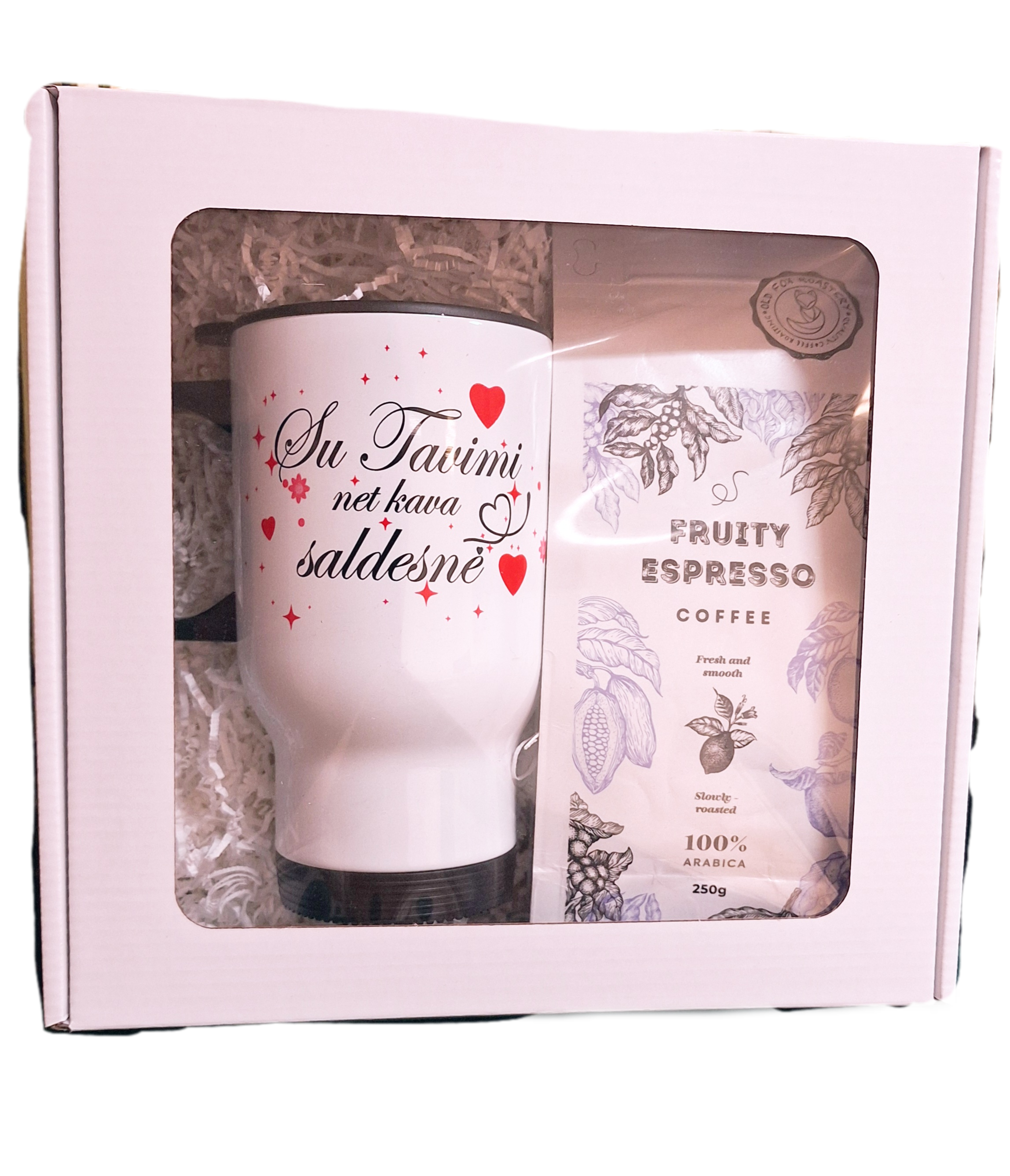 Rinkinį sudaro kelioninis puodelis ir 250ml kavos pakuotė dovanų dėžutėje.